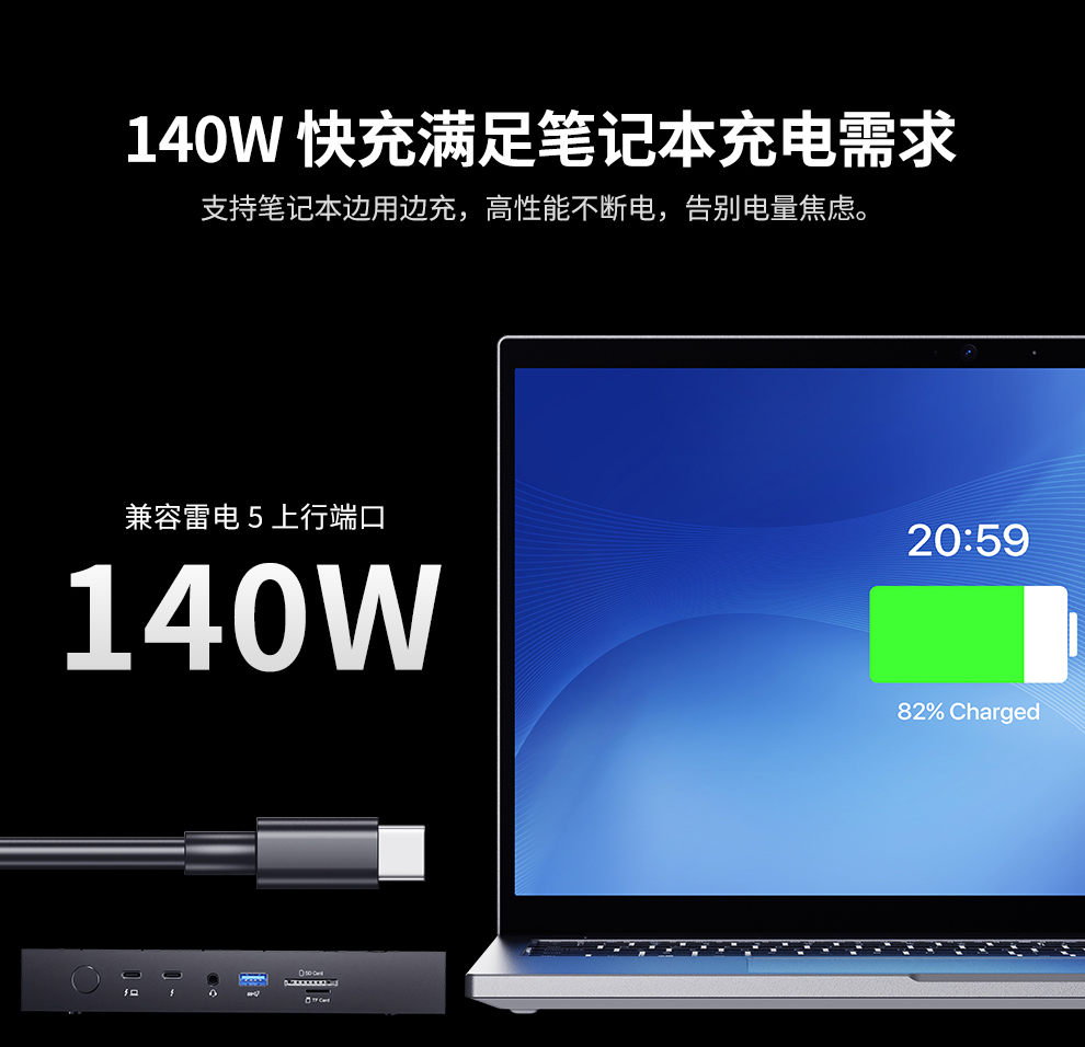 1*雷电5上行接口(支持PD供电,最高可达140W) 1*雷电5下行接口(支持PD供电,最高可达30W,最高可支持DP 2.1视频信号输出) *上行接口用于连接笔记本、Mini PC等需要扩展性能的设备 *下行接口用于连接鼠标显示器等电脑外设,两个雷电5接口共享80Gbps数据传输带宽