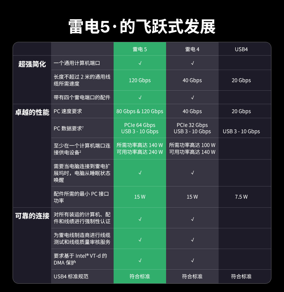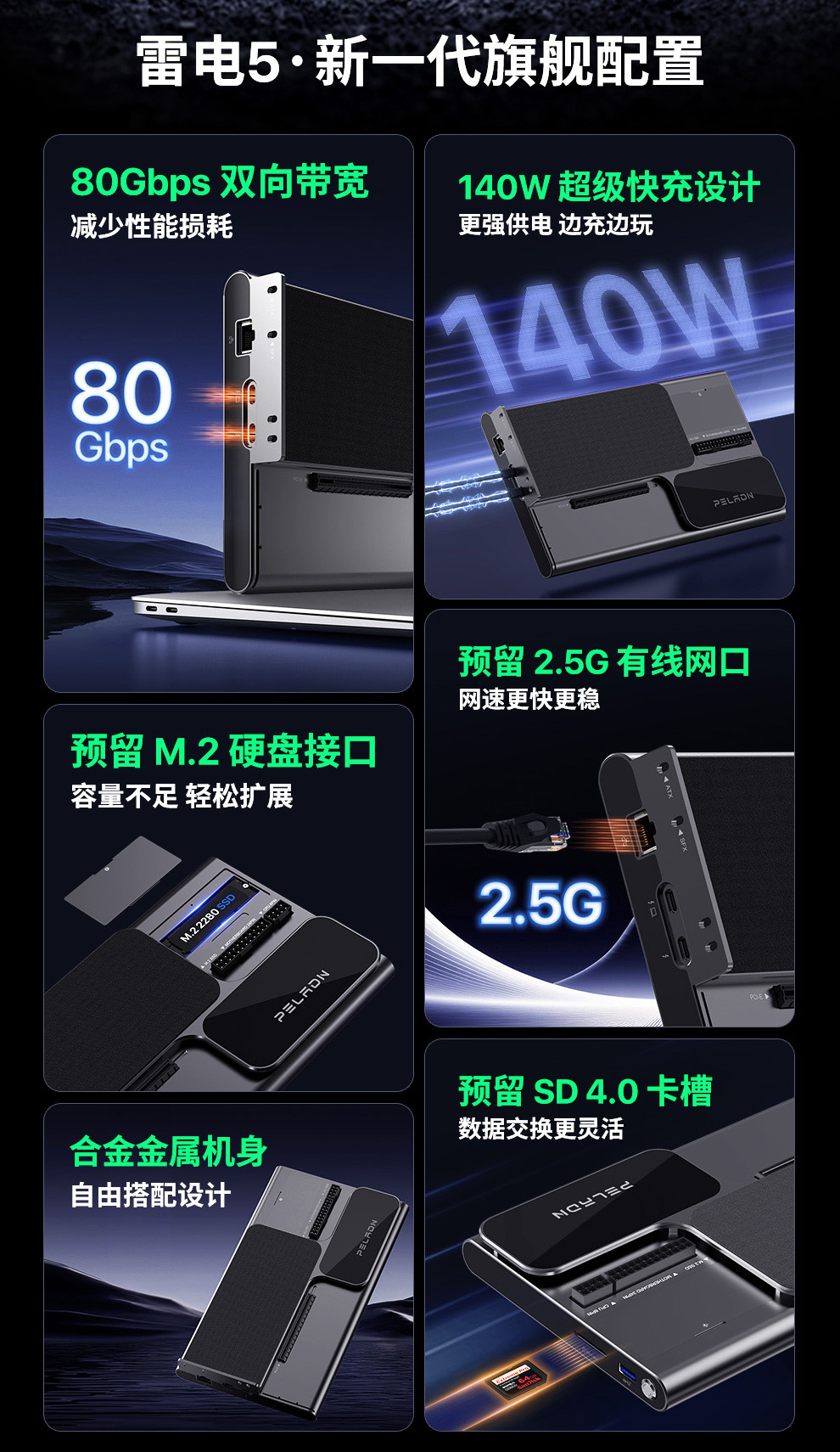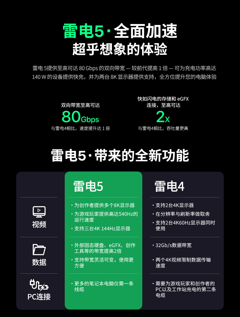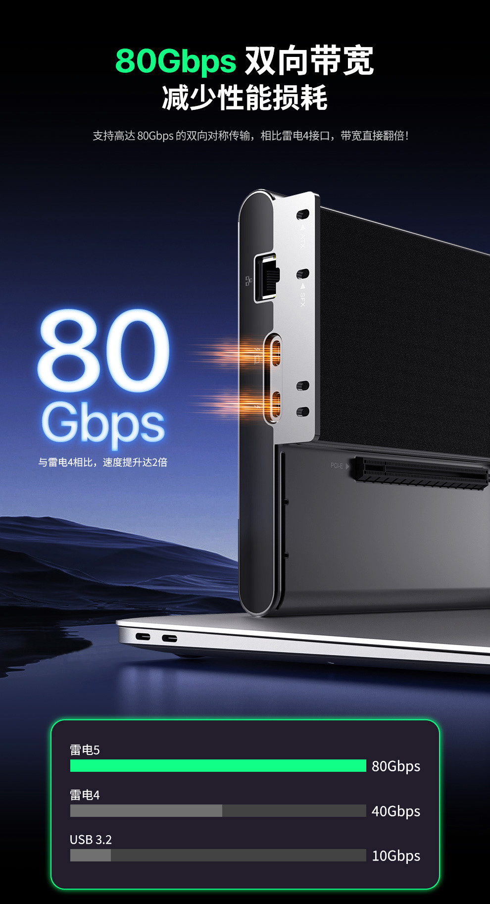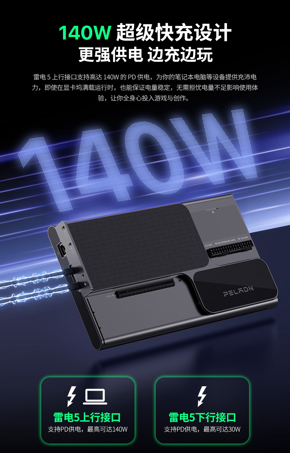 | 雷电接口 | 搭载JHL9480雷电5控制芯片 1个雷电5上行接口(支持PD供电,最高可达140W) 1个雷电5下行接口(支持PD供电,最高可达30W,最高可支持DP 2.1视频信号输出) |