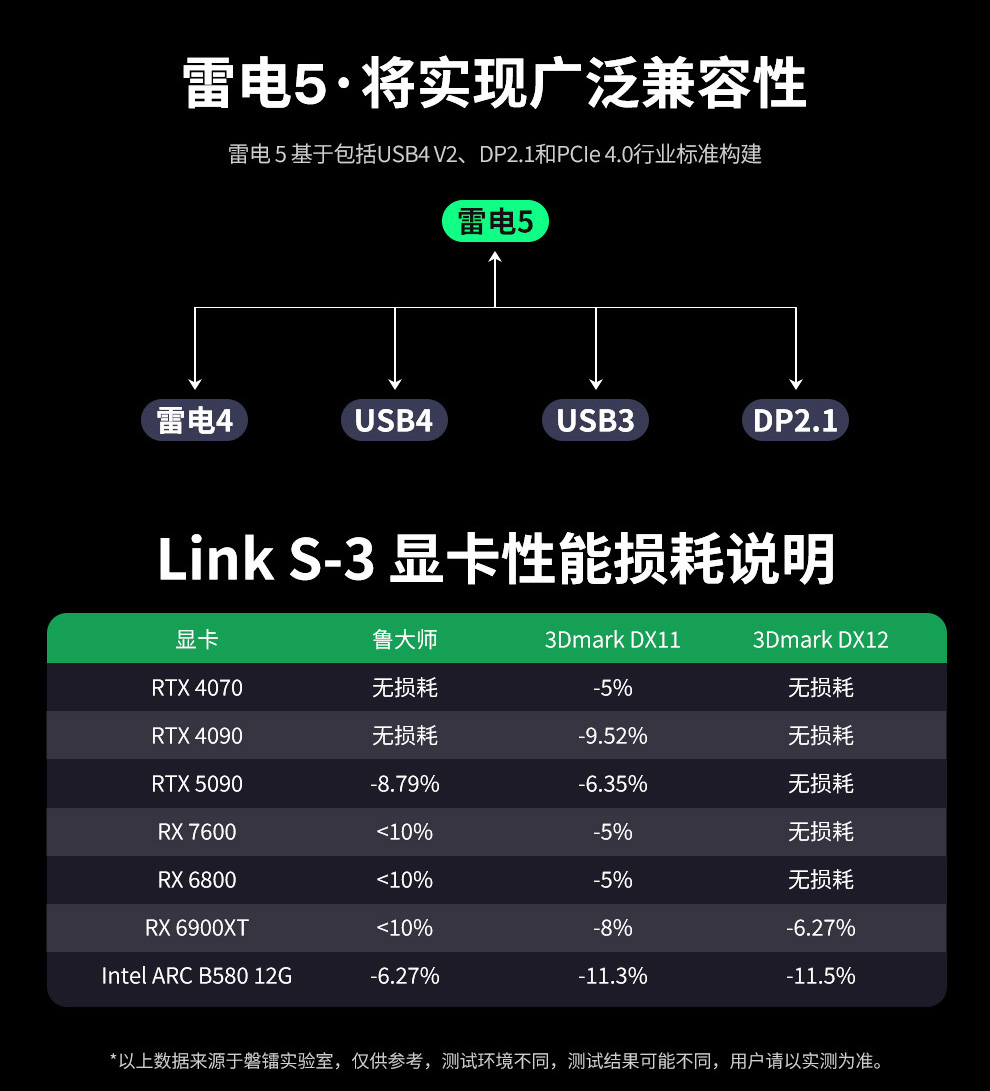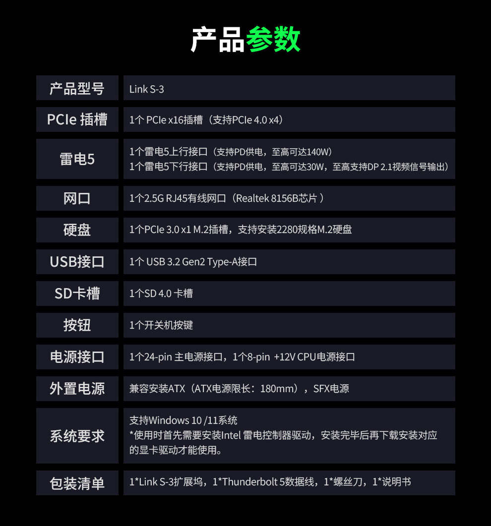 | 包装清单 | 1*Link S-3扩展坞,1*Thunderbolt 5数据线,1*螺丝刀,1*说明书 | ||||||||